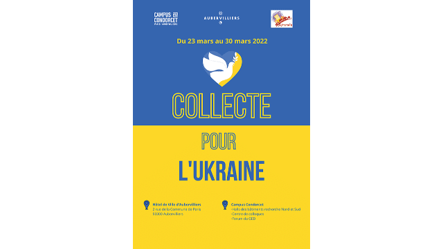 Face à la situation qui frappe l’Ukraine, le Campus et ses établissements membres organisent, en partenariat avec la ville d’Aubervilliers et l’association Alteralia, une collecte de vêtements, aliments, puériculture, couvertures, etc., du 23 au 30 mars.