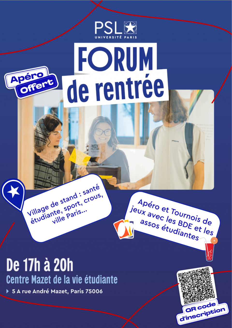 Pour bien démarrer cette nouvelle année universitaire, nous avons le plaisir de vous inviter au Forum de rentrée PSL, une soirée ludique et conviviale organisée au Centre Mazet, le mercredi 11 septembre de 17h à 20h.