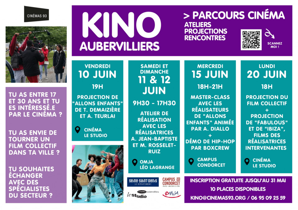 Cinémas 93 propose un parcours cinéma à Aubervilliers pour les jeunes de 17 à 30 ans intéressés par le cinéma. Il s’agit d’ateliers de pratique amateure jumelés avec des rencontres avec des professionnels du cinéma. Le parcours se présente en 4 temps: