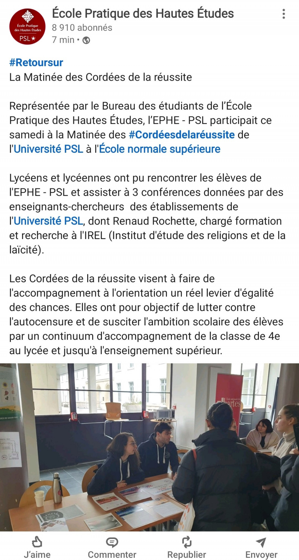 L'EPHE-PSL représentée à la matinée des Cordées de la réussite (28/01/2023) - Merci à l'EPHESE !